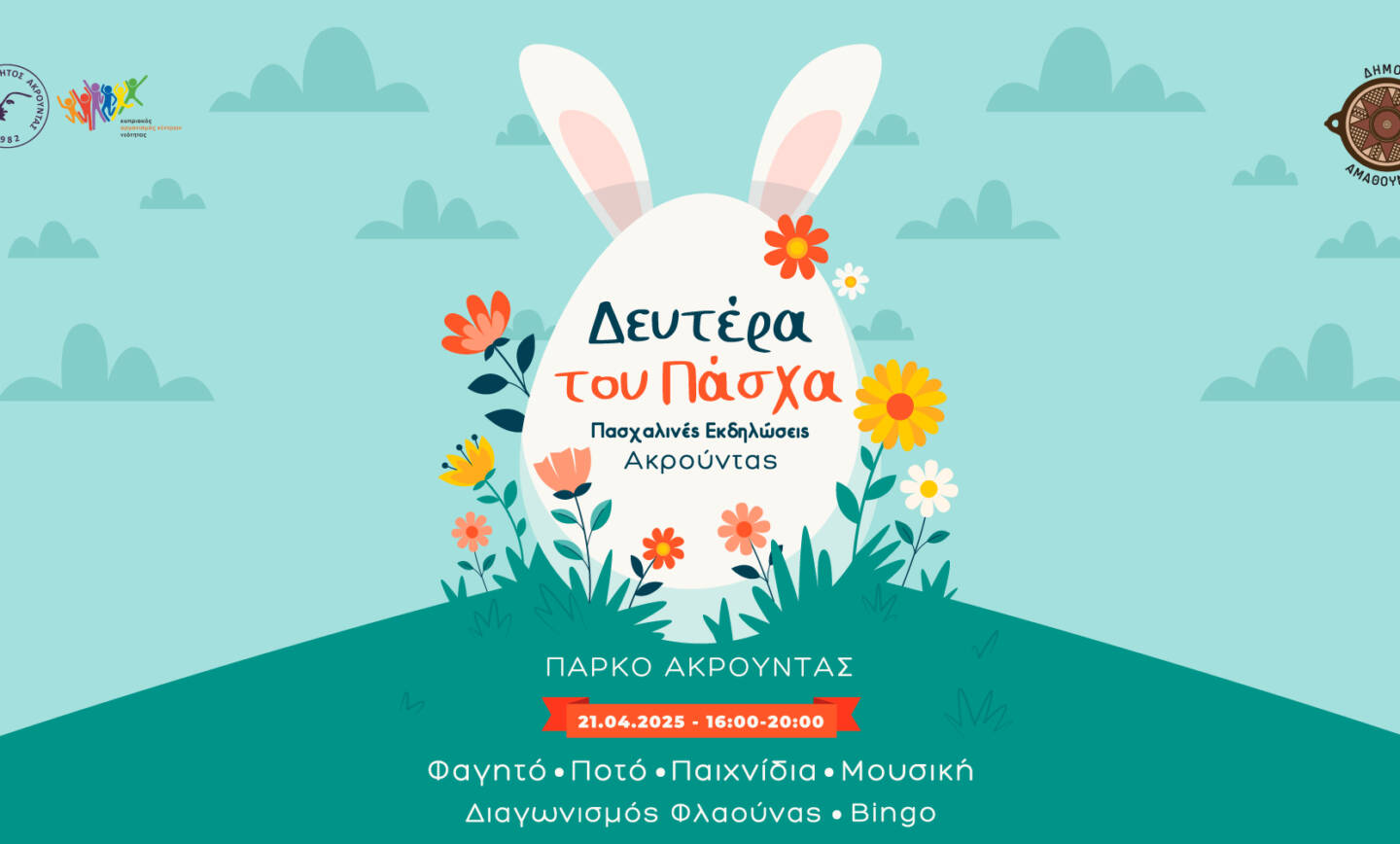 Ο Δήμος Αμαθούντας και το Κέντρο Νεότητας Ακρούντας σας προσκαλούν στις Πασχαλινές Εκδηλώσεις Ακρούντας, που θα πραγματοποιηθούν τη Δευτέρα του Πάσχα, 21 Απριλίου, στις 16:00 στο Πάρκο Ακρούντας. Οι εκδηλώσεις θα περιλαμβάνουν τα γνωστά πλέον...