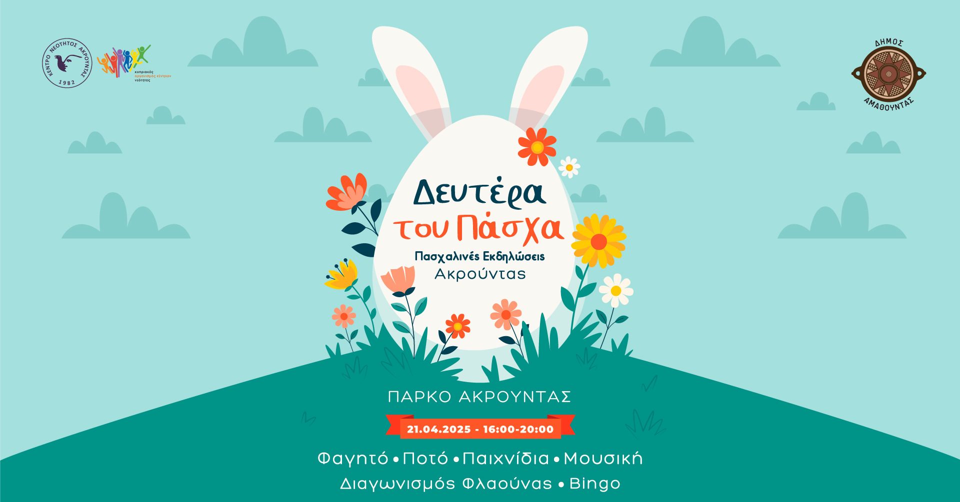 Ο Δήμος Αμαθούντας και το Κέντρο Νεότητας Ακρούντας σας προσκαλούν στις Πασχαλινές Εκδηλώσεις Ακρούντας, που θα πραγματοποιηθούν τη Δευτέρα του Πάσχα, 21 Απριλίου, στις 16:00 στο Πάρκο Ακρούντας.