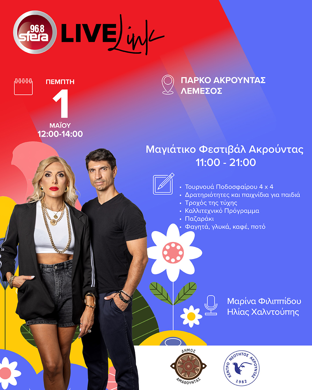 | 12:00 – 14:00 | Live Link – Sfera 96.8 with Marina Filippidou & Ilias Chaltoupis |