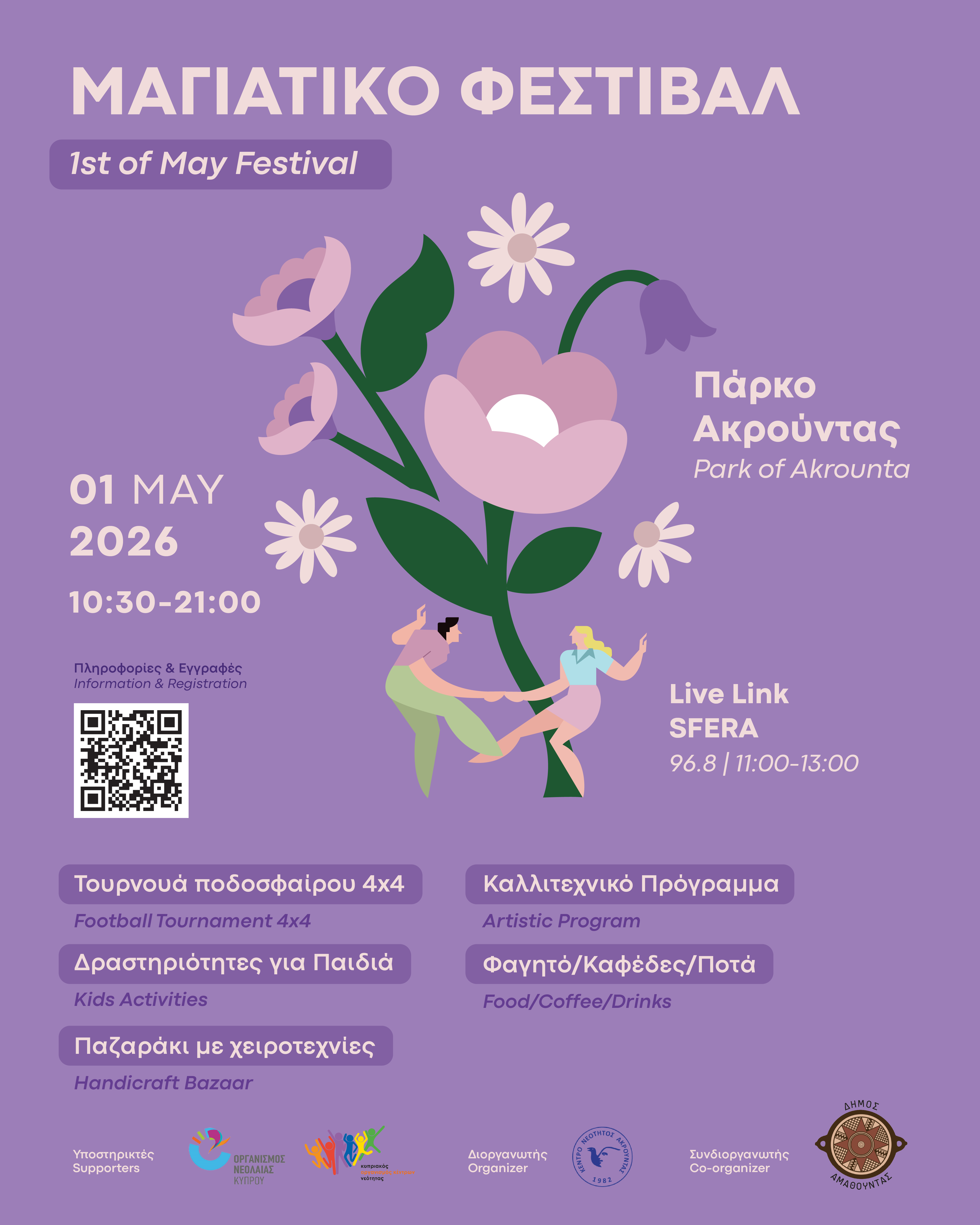 We are waiting for you on Friday 1st of May, 10:00-21:00 at the Park of t Akrounta to welcome spring together with an event for all tastes and ages.
